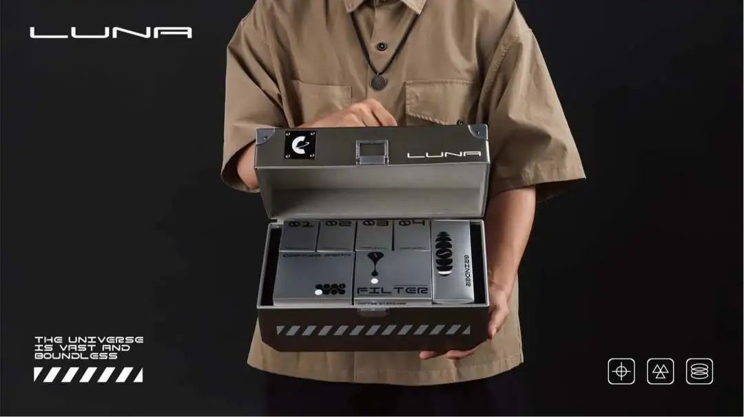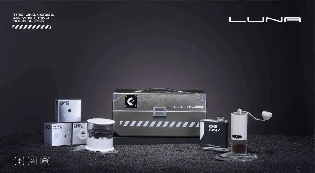 深空漫步礼盒也是在表达人类的求索,华夏的浪漫,诉说在太空探索从未间断的步伐。礼盒包括金属收纳箱、咖啡豆、咖啡研磨器、电动手冲咖啡机、月饼,科技潮流感十足!把宇宙的浩翰和浪漫带给每一个人,探索宇宙的神秘辽阔,共同奔赴璀璨星河。