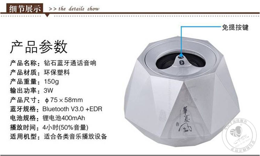 【产品名称】:钻石蓝牙通话音响【产品材质】:环保塑料【产品质量】:150G【输出功率】:3W【产品尺寸】:75*58MM【蓝牙规格】:Bluetooth V3.0+EDR【电池规格】:锂电池400mAh【播放时间】:4小时(50%音量)【适用机型】:适合各类音乐播放设备【市 场 价】:352元