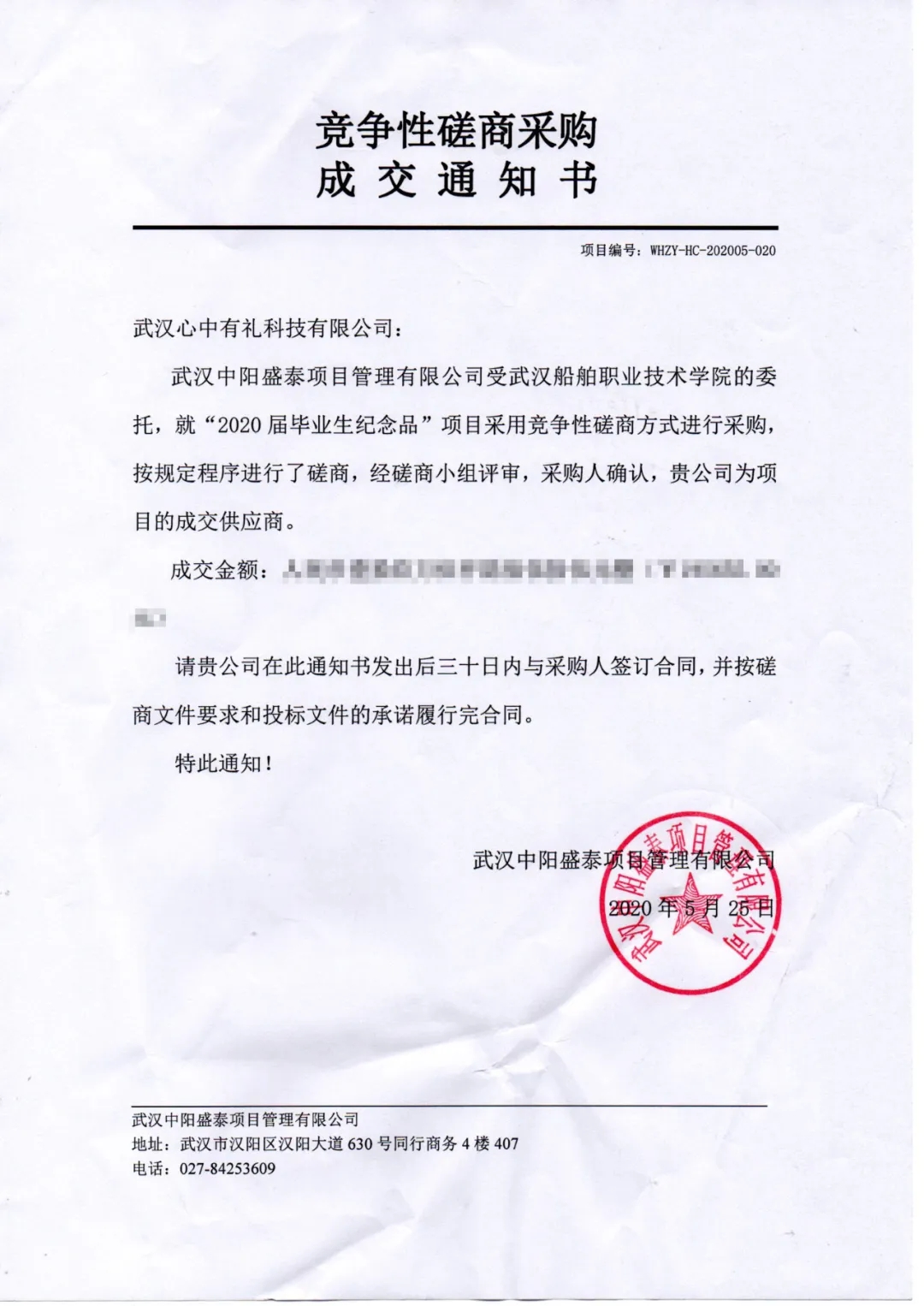 在“武汉船舶职业技术学院2020届毕业生纪念品项目”竞争性磋商采购中中标!