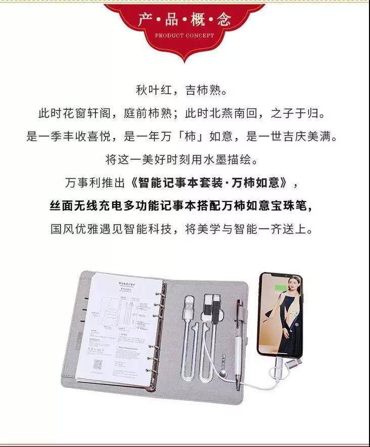 「万柿如意」智能笔记本套装,全新无线充电功能。搭载16G内存,8000mAh电池容量,配备精致签字笔,是高档笔记本套装的不二之选!
