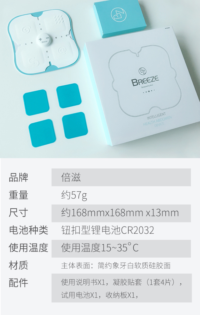 交货期:品牌:倍滋重量:约57g尺寸:约168mmx168mmx13mm电池种类:钮扣型锂电池CR2032使用温度使用温度15-35°C材质:主体表面:简约象牙白软质硅胶面配件:使用说明书X1,凝胶贴2套(1套4片),试用电地X1,收纳板X1,
