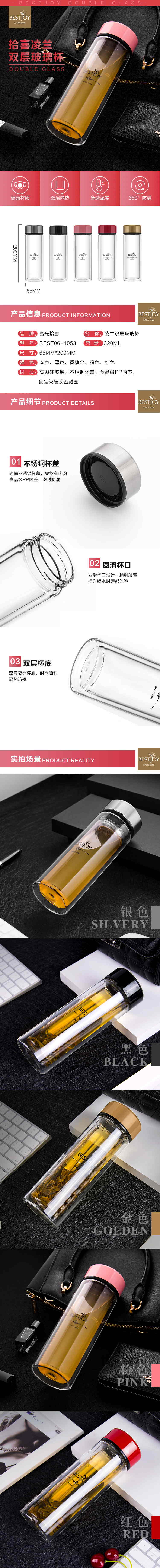 交货期:品牌富光拾喜名称;凌兰双层玻璃杯型号: BESTOI6-1053(容量:320ML尺寸:65MM*200MM颜色:本色、黑色、香槟金、粉色、红色材质:高硼硅玻璃、不锈钢杯盖、食品级PP内芯、食品级硅胶密封圈