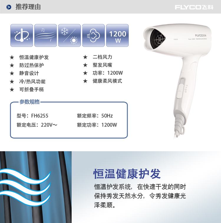 交货期:型号:FH6255名称:飞科电吹风额定电压:220V额定频率:50Hz额定功率:2000W