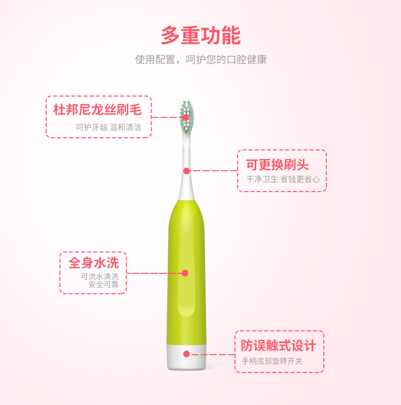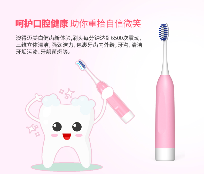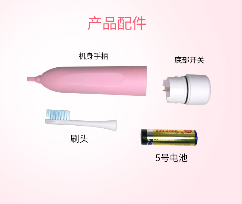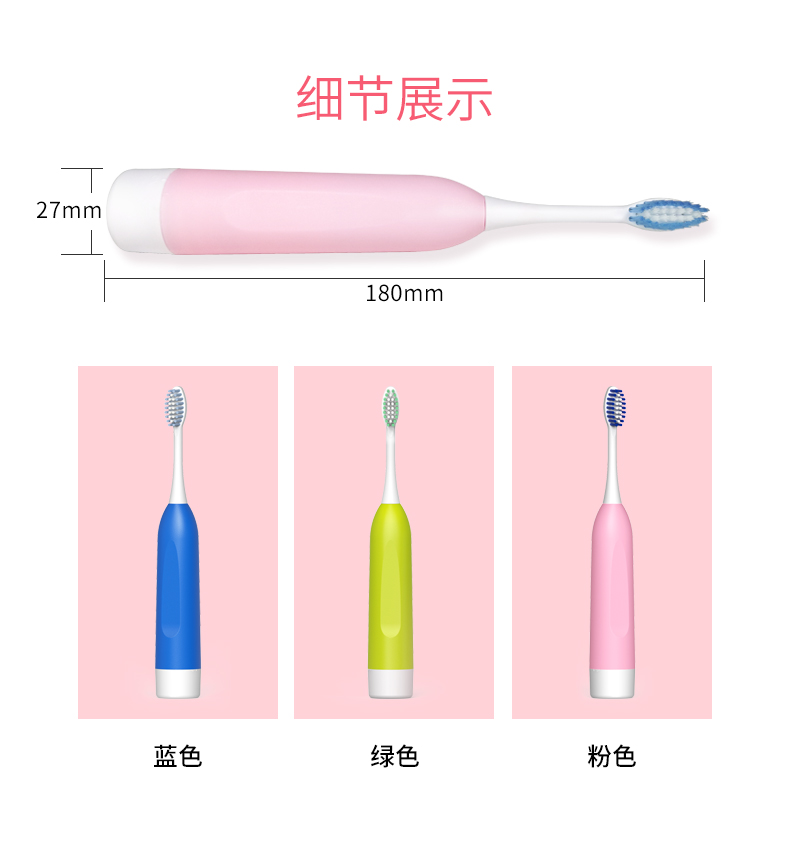 交货期:品牌澳得迈:型号DY-109工作电压:DC1.5V电池型号:5号碱性干电池震动频率:6500次/分钟产品材质:PP产品重量:62g(含电池)产品尺寸:27x180mm适用人群:3至12岁以上大人产品功效:清洁口腔清洁牙