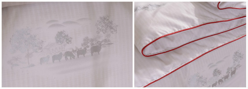 【产品说明】面料采用防羽处理的高密棉,原料采用优质羊毛,经过脱脂消毒梳理处理。具有不钻毛,抗菌,防螨的特殊功效。保暖,透气性好。