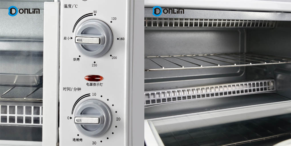 【产品功能】 1、上、下各一根发热管 2、温度可调范围90-230°C 3、30分钟带连续烤定时器,带复位铃声 4、底门翻转式接渣盘 5、可烤4片面包及9英寸比萨